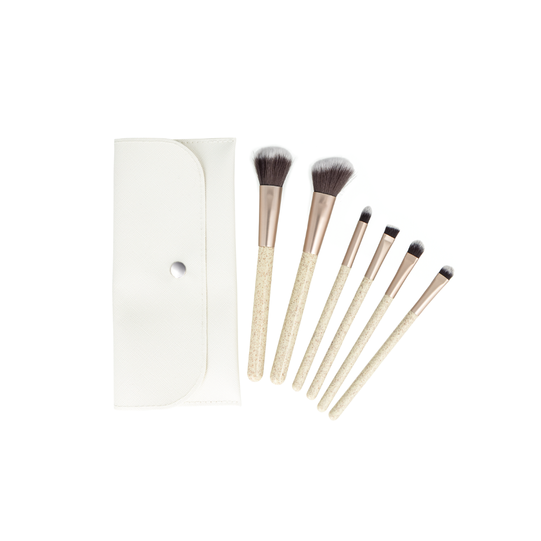 The sustainable material made of PP and wheat straw fits comfortably in the hand, the aluminium ferrule and the ultra-soft brush hairs with colour gradient make this brush set your high-quality beauty companion for everyday and when travelling.